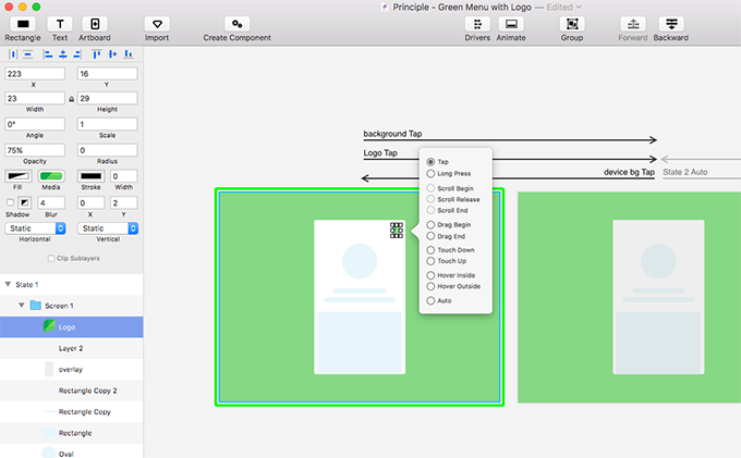 In this example we will start by creating our first transition. Select the element that you want to act as the trigger. You will see a small circle with a lightning bolt icon. Click that icon and an action menu will pop up. I am animating a menu icon, so I am going to choose a ‘tap’ interaction. Click in the circle, and drag the arrow it creates to the screen you want to transition to. This will create your initial transition which you can test in principles live action screen.
